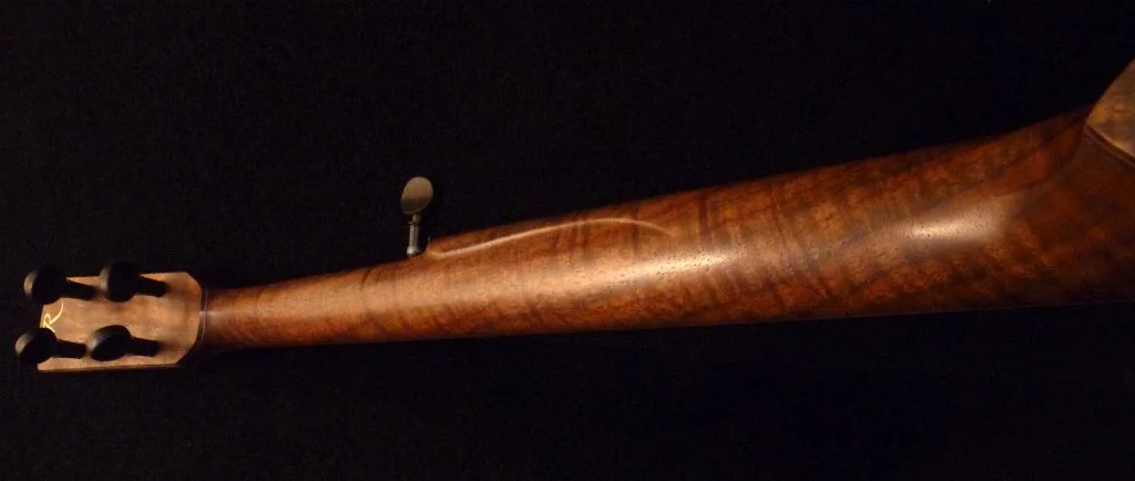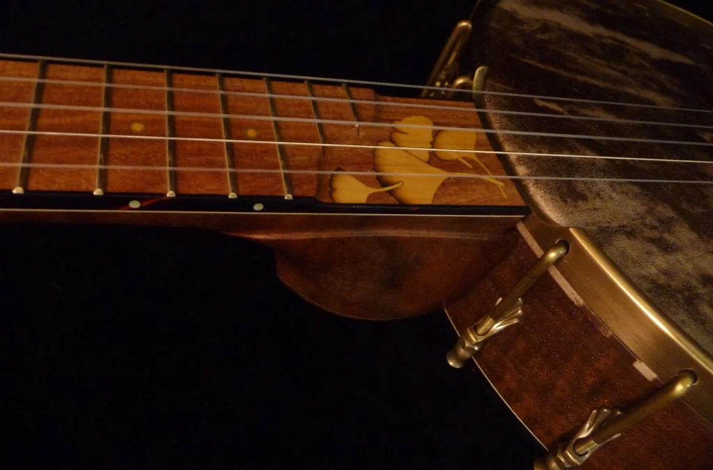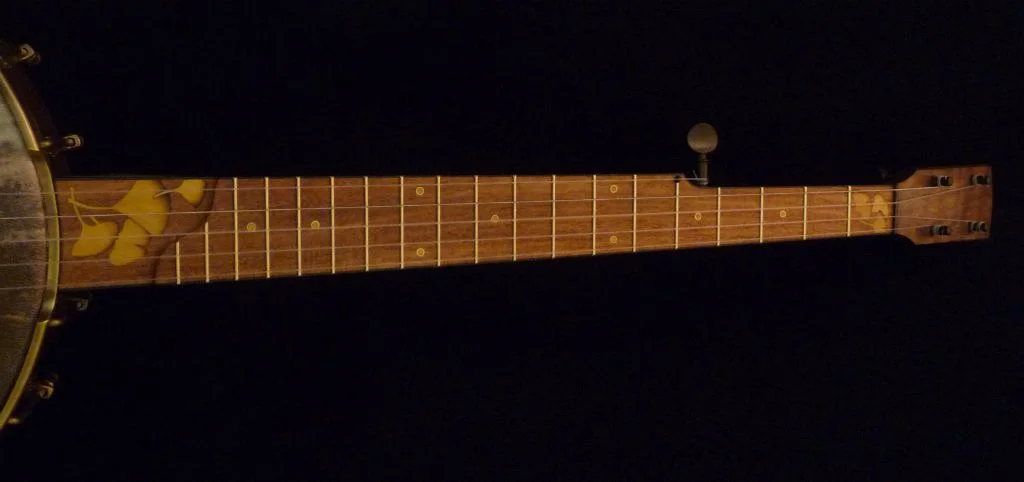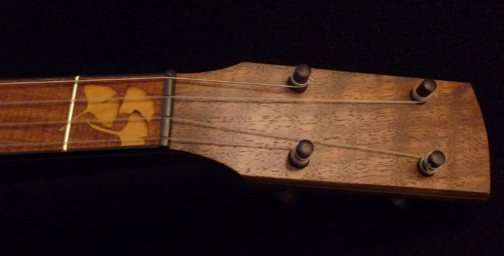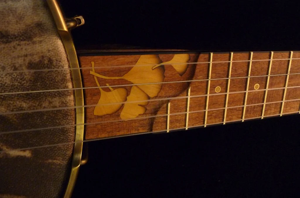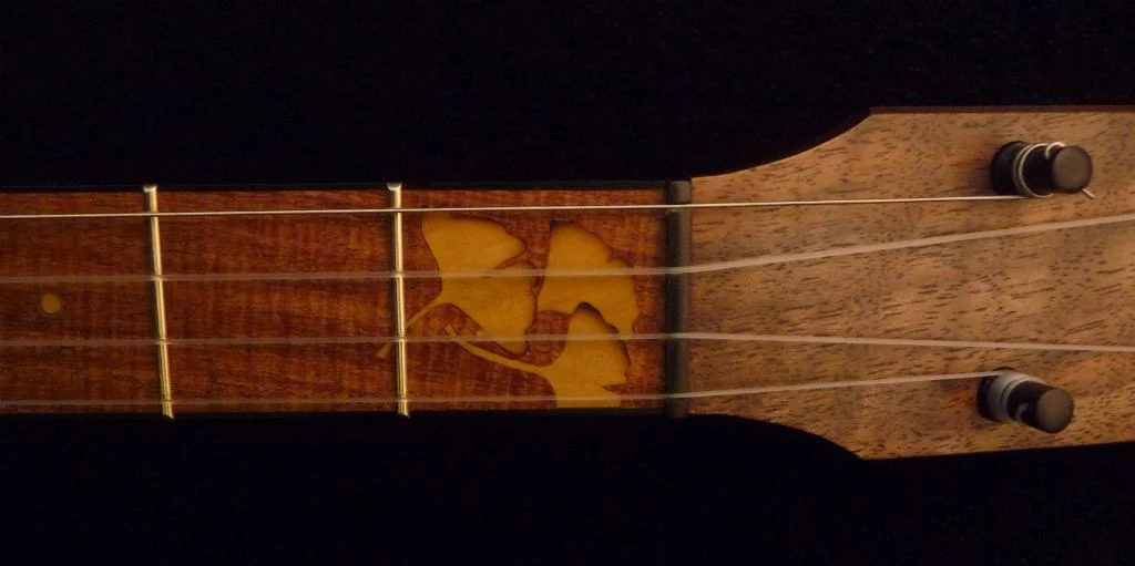 Gingko leaf inlays at 1st fret, scoop and heel of Pequilla amarillo