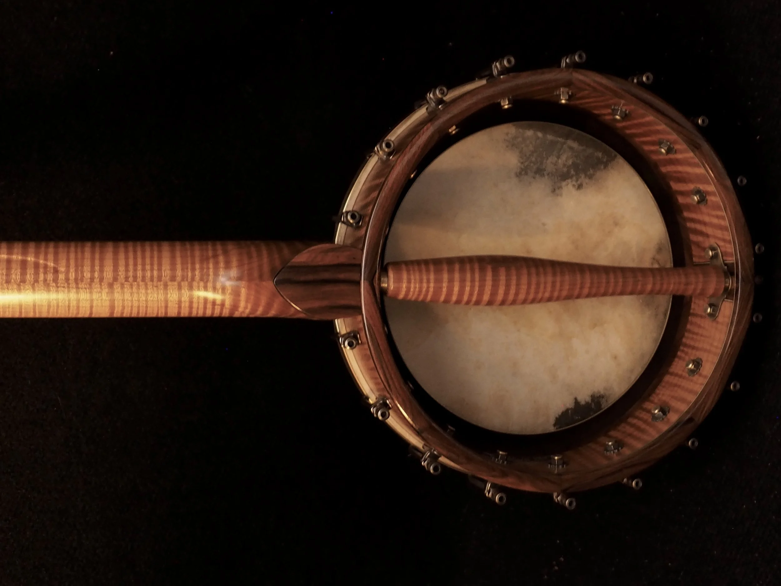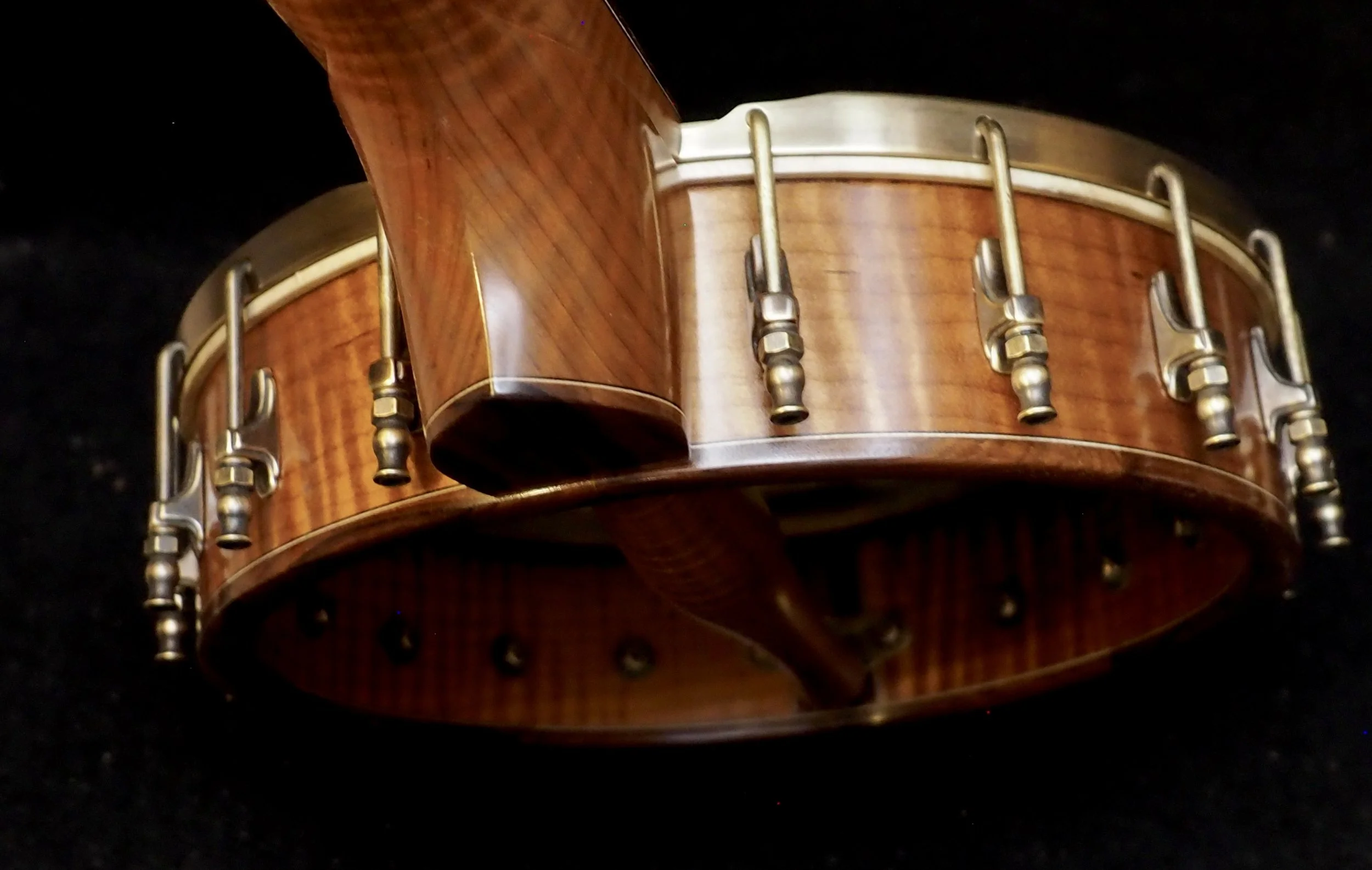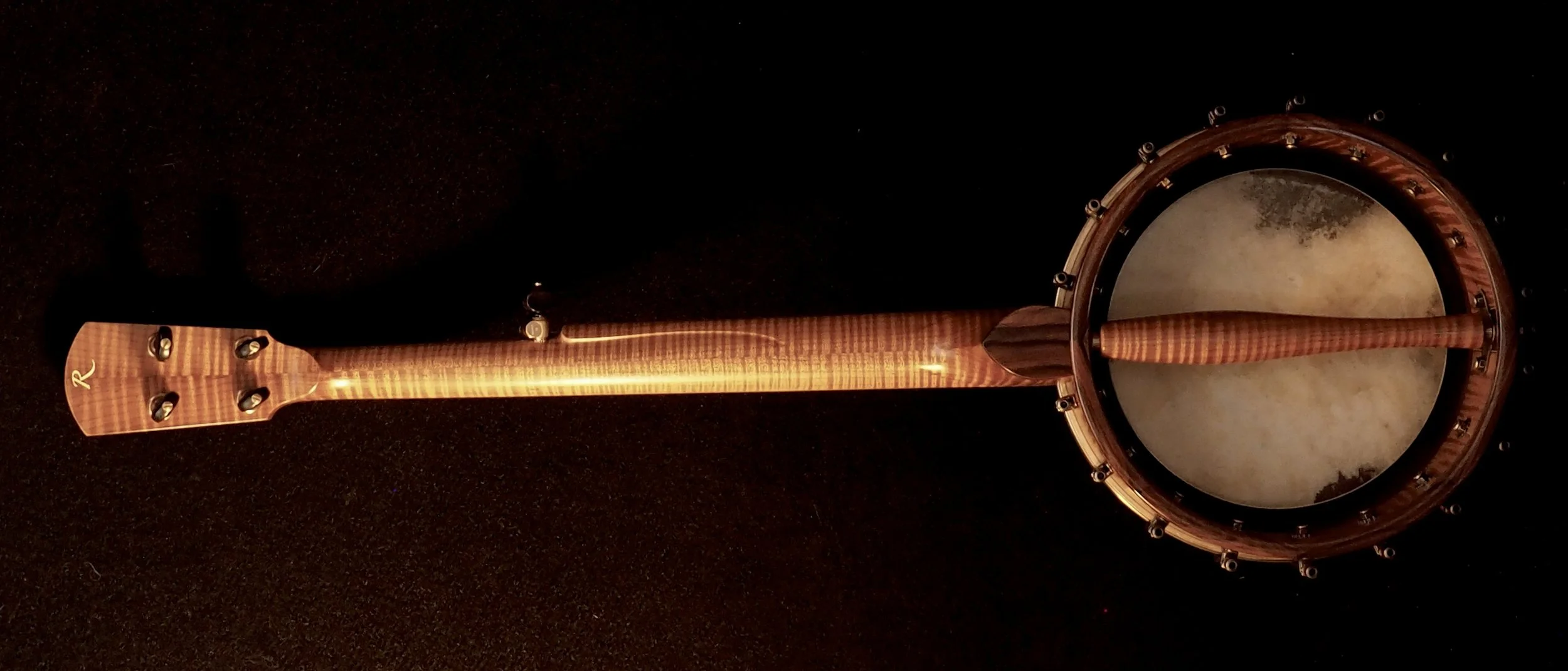 Figured torrefied maple neck and 11” rimDobson tone ringPau ferro trimJ3 pegheadWave scoop at the 15th fretDeco cast bronze shoesShell cast bronze tailpieceOiled goatskin headLacquer finishAmeritage case